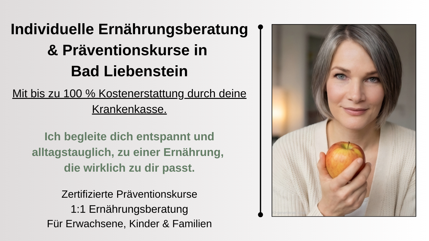 In meinen zertifizierten Präventionskursen lernst du Schritt für Schritt, wie du deine Ernährung langfristig und alltagstauglich verbessern kannst.